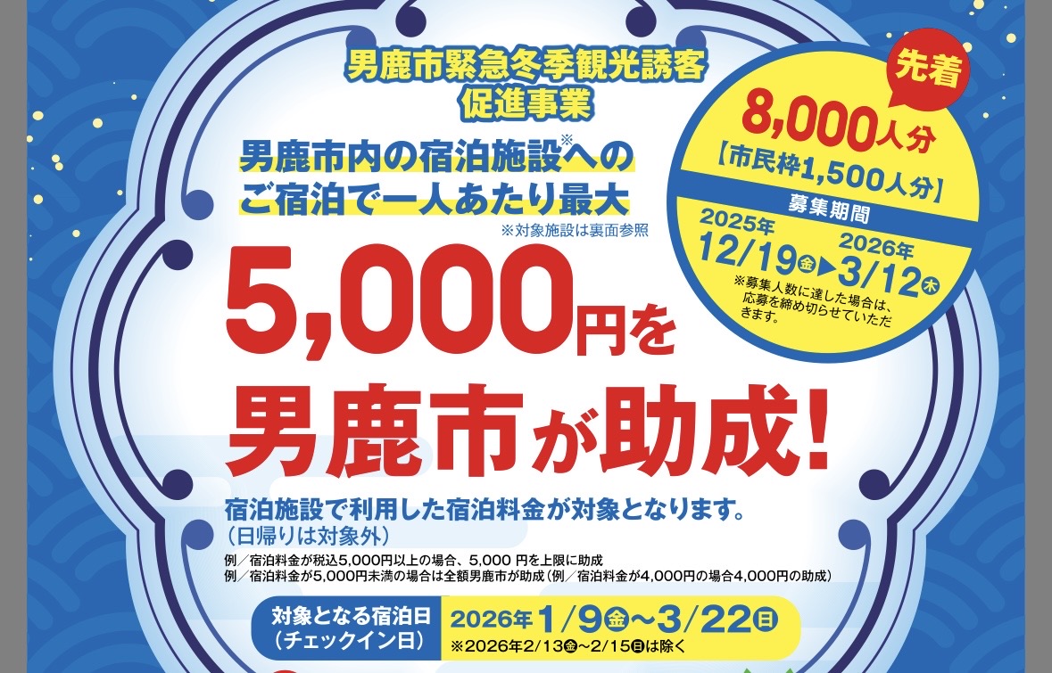 男鹿市内の宿泊施設に泊まって、おひとり様5,000円の宿泊助成!(男鹿市緊急冬期観光誘客促進事業)